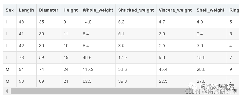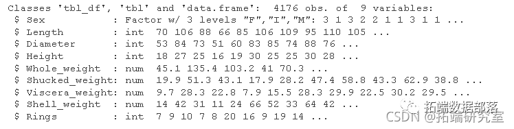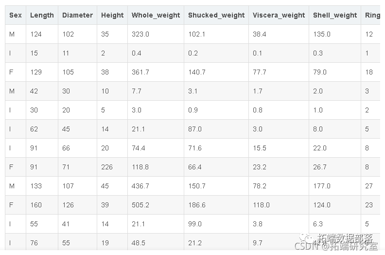 | 性别 | 分类(因子) | M、F 和 I(婴儿) | |