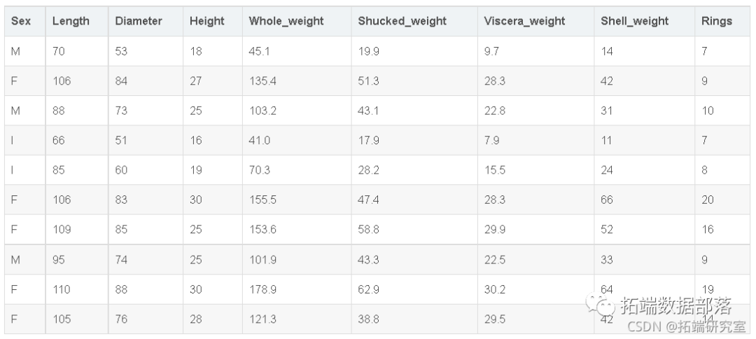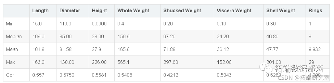 | 鲍鱼的环 | 连续 | +1.5 给出以年为单位的年龄 |