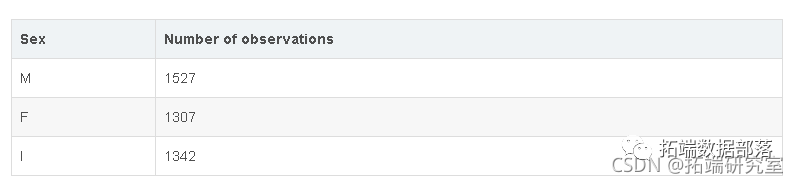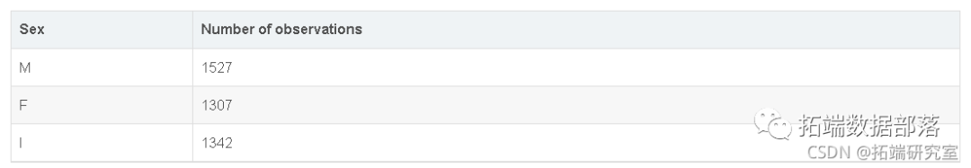 看一下数据集的摘要,我们可以看到,数据在雄性、雌性和婴儿这三个因素水平之间的分布是相当均匀的。