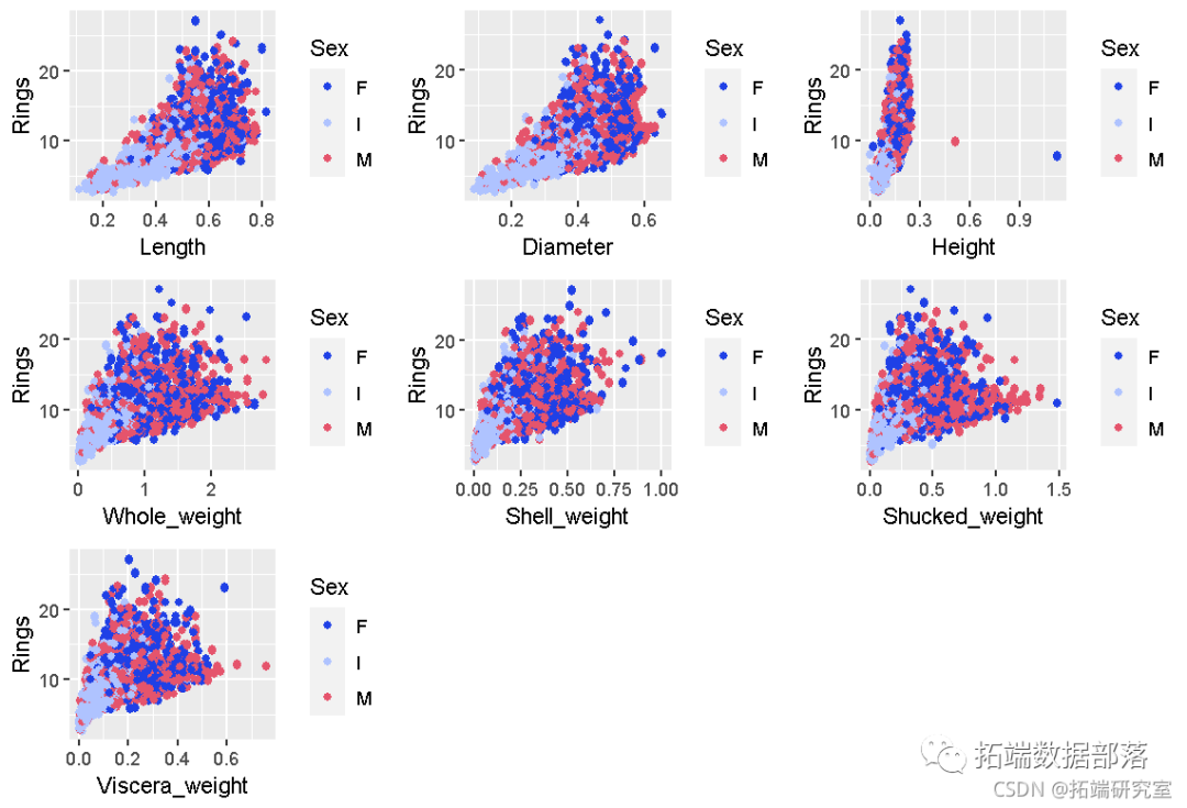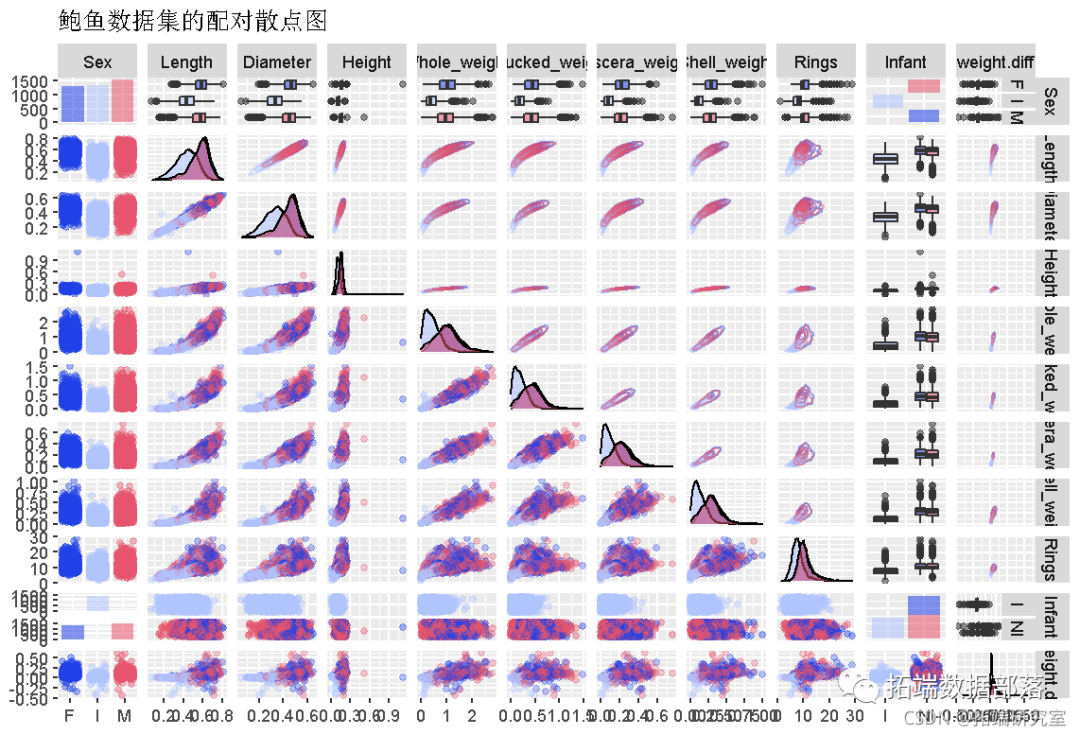 同样,Whole\_weight似乎与其他重量预测因子高度相关,是Shucked\_weight、Viscera\_weight和Shell\_weight之和。