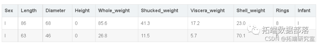 我们看到,有两个观测值的高度可能没有被正确记录,因为其他预测因子似乎都有有效的值。另外,如果我们看一下预测因子Whole_weight,我们会发现这些值与其他观察值相比真的很小,而且低于第一个四分法。这告诉我们,这可能不是一个数据错误,因此我们不能将这些数据从我们的数据集中排除。