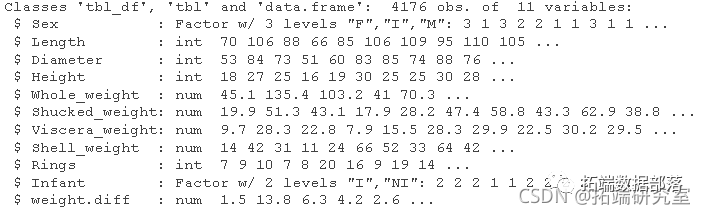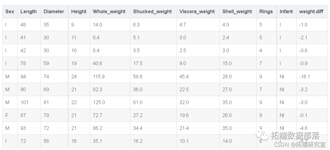 我们还将添加一个名为weight.diff的新变量。我们可以在摘要中看到有四种不同的重量测量方法,即Whole\_weight、Shucked\_weight、Viscera\_weight和Shell.weight。Whole\_weight是其他重量预测因子的线性函数,在剥壳过程中损失的水/血的质量未知。