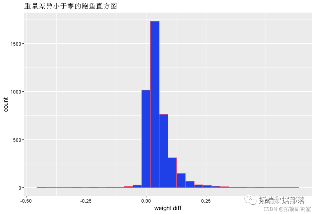 如果我们绘制新添加的weight.diff变量的直方图,我们可以看到,当weight.diff为负数时,有一些观察结果。