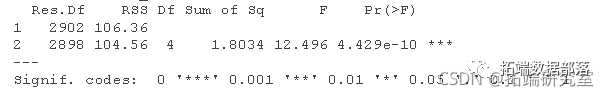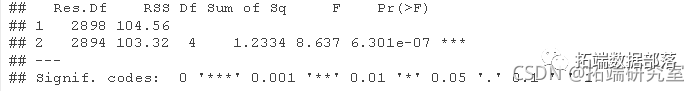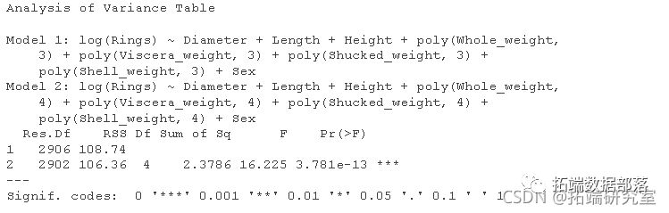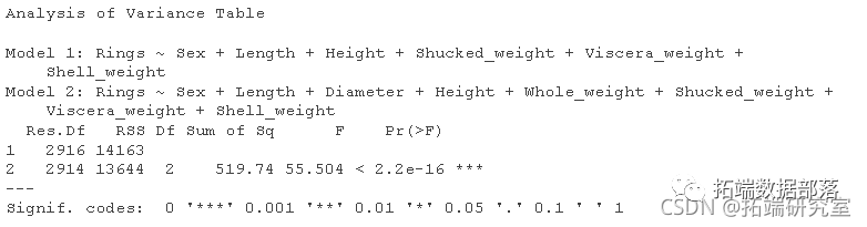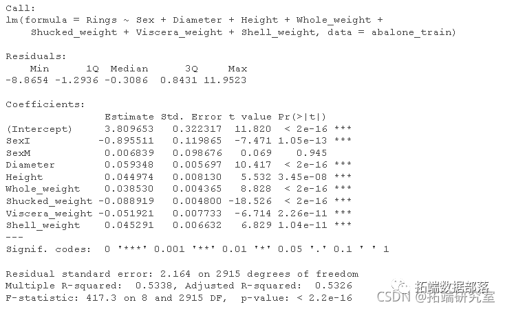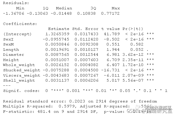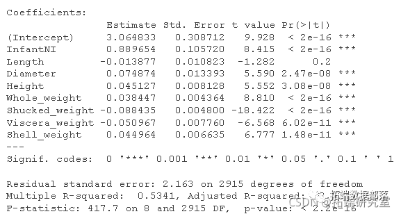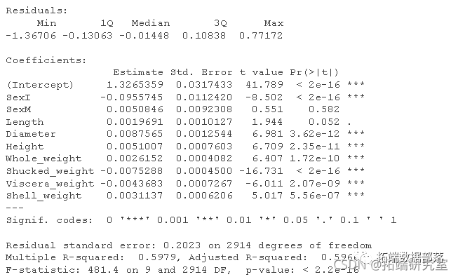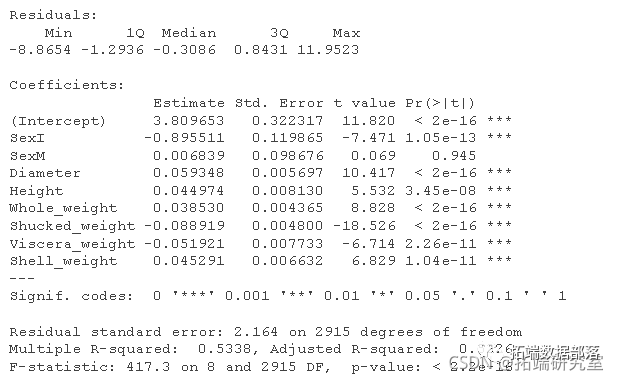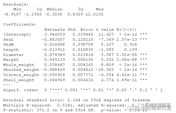 在用所有预测因子拟合加性模型后,我们可以看到,除了长度之外,测试统计显示所有变量都是显著的。正如我们之前从配对图中看到的那样,长度和直径的预测因子是高度相关的。我们还看到,不同重量的预测因子也是显著的,尽管它们应该是彼此的线性函数。