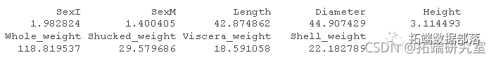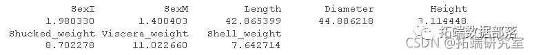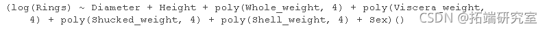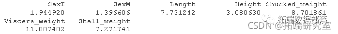 初始数据分析期间的下一个重要发现是预测变量之间存在非常高的多重共线性。这是有道理的,因为我们之前发现 Whole_weight 预测在某种程度上依赖于其他重量预测。Length 鲍鱼的 Diameter. 以下是 来自加法模型的模型系数的 变异膨胀因子值。