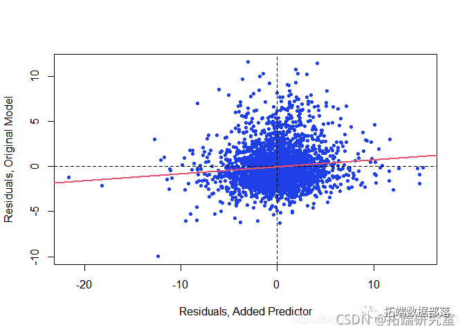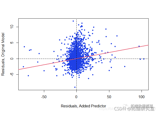 同样地,变量添加图将这些残差相互之间的关系可视化。将因变量的残差与预测的残差进行回归,并将回归线添加到图中,也是有帮助的。