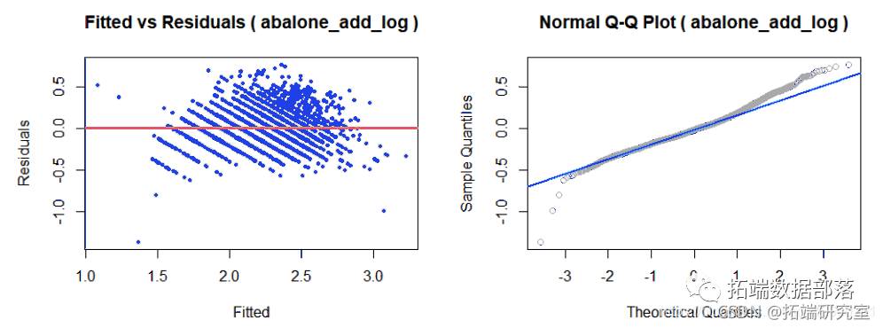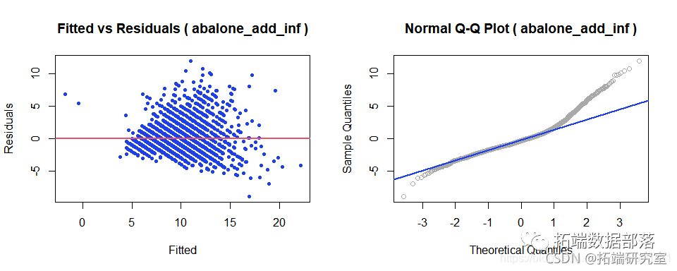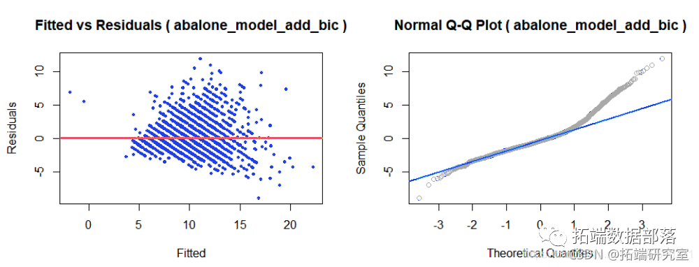 我们从一个加法模型开始,该模型包含所有名为abalone_add的预测变量 。我们继续检查各种假设和测试,以进一步提高模型的准确性并降低 rmse。