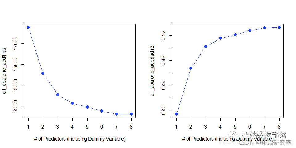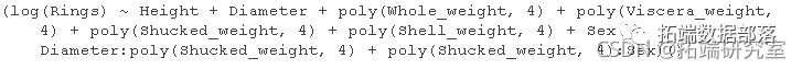 在数据的背景下谈论这个分析,我们可以从模型中看到, Length 变量可能不会成为预测鲍鱼年龄的重要因素。我们可以看到我们没有在我们的模型中选择这个。这种情况是有意义的,因为 Length 或多或少地相关 Diameter (即长度越大直径越大),并且由于我们已经将直径带入我们的模型,所以我们不需要鲍鱼数据集中的长度。