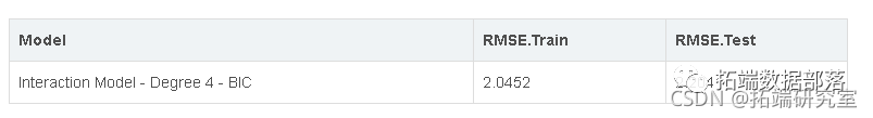 候选模型 2 是 abalone\_int\_full。回想一下,详尽的搜索过程表明,当我们所有的预测变量,我们得到最好的模型。所以我们决定添加模型中交互项和多项式次数为 4 的所有预测变量。该模型具有最高的多重共线性,但从 rmse 和预测以及置信区间来看是非常合理的。
