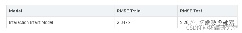 候选模型 3 是 abalone\_int\_infant。正如我们最初的数据分析表明分类变量 Sex 有 3 个因子水平。female, male 和 infant。水平 female 和 male 我们在分布方面极其相似,因此我们将这两个水平合二为一,使预测变量的总水平为 Sex 两个。由于这种级别的降低,与前两个模型相比,该模型可能是最简单的模型。我们对此进行了彻底的分析,最终模型具有相似的 rmse、预测和置信区间。这就是我们选择该模型作为候选模型之一的原因。