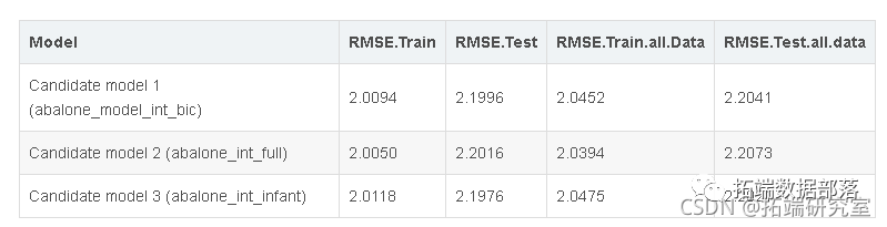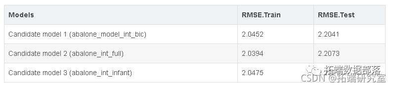 经过我们的分析,我们找到了几个不错的候选模型,我们选择了模型 abalone\_int\_infant 作为我们的最佳模型。