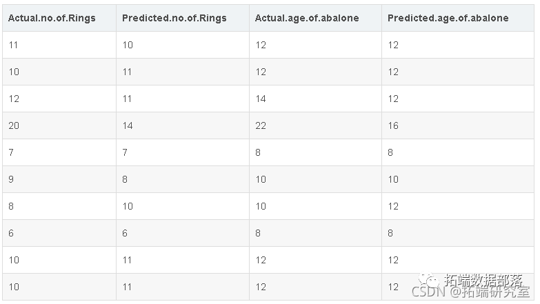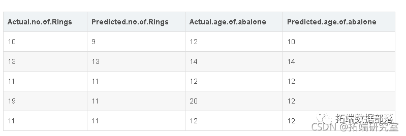 我们可以从上面的例子中看到,我们从测试和模型中计算了环数和年龄,用于少数观察。我们看到我们的模型正确预测了鲍鱼的年龄,或者非常接近鲍鱼的实际年龄。这些是模型以前从未见过的测试数据中的 5 个样本观察值。我们可以多取一些并执行相同的过程,看看我们的模型对鲍鱼年龄的预测效果如何。