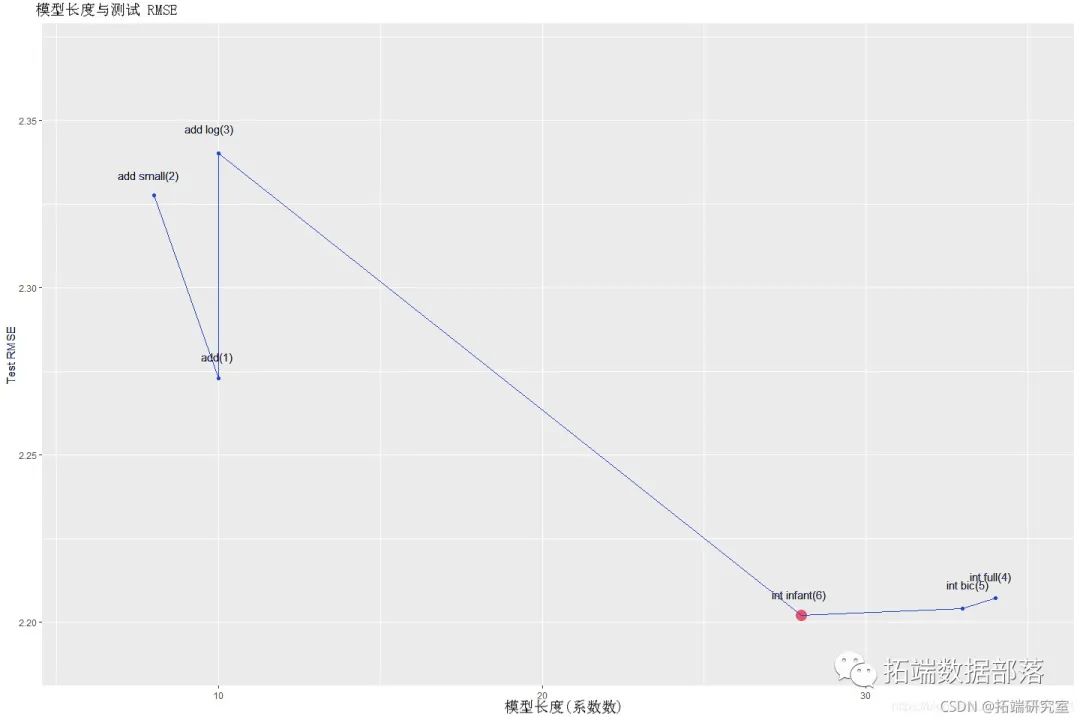 下图显示了整个分析报告中所选模型的 rmse(以红色标记)、候选模型和模型的其余部分以及它们的测试 rmse 比较。我们可以清楚地看到,我们选择的模型 abalone\_int\_infant 也在