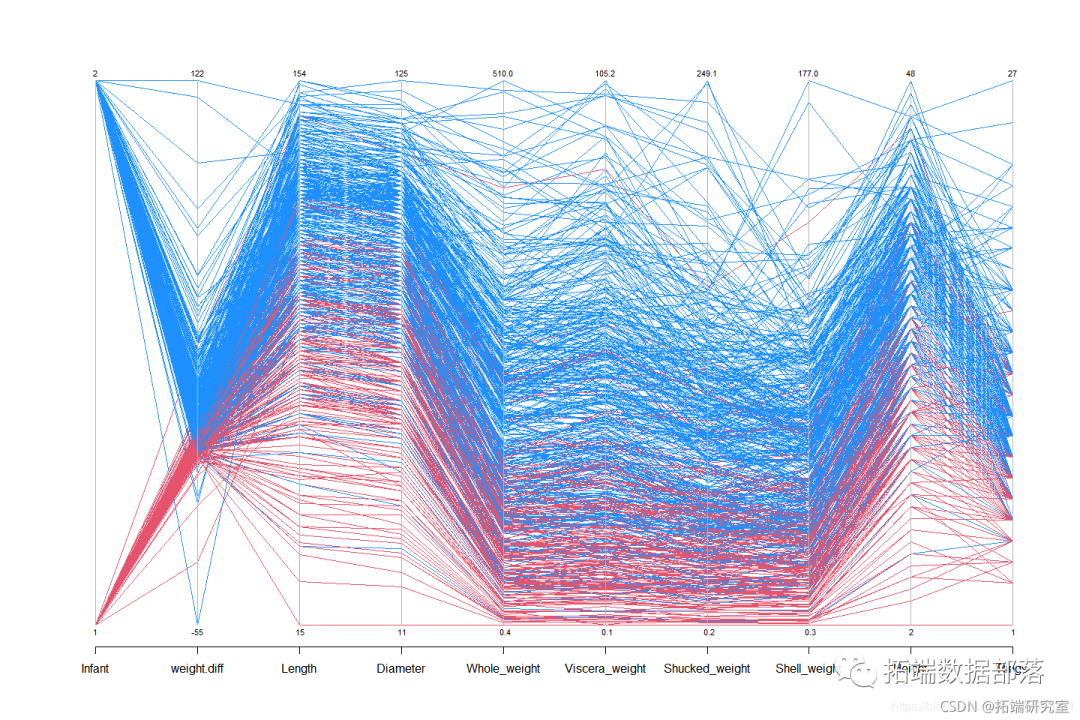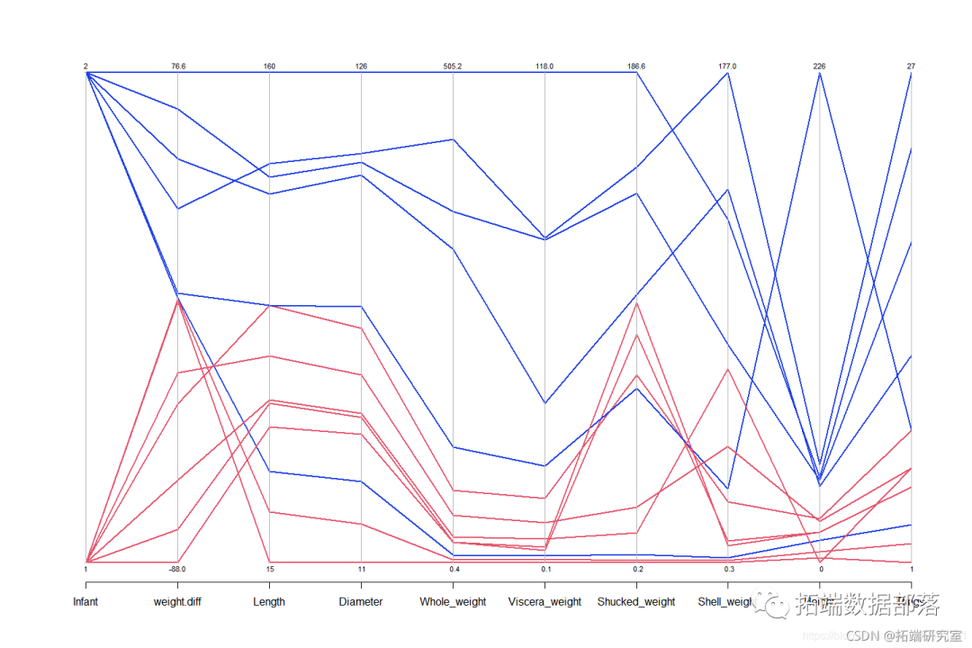如果我们使用平行坐标图绘制异常观测值,我们可以看到 Height 这些观测值与鲍鱼的平均高度相比更短。Whole\_weight 和 Viscera\_weight which as lower也是如此 。此外 weight.diff ,其中一些观察结果是否定的,这是我们在初始数据分析期间发现的。