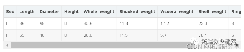 请注意,总共有153个观测值的综合权重超过了Whole_weight。当我们看了10个这样的观测值时,似乎其他的值都是正确的,没有任何相似之处,所以我们确信这可能是一个数据输入错误。因此,我们将保留这些观察结果,以便进一步分析。