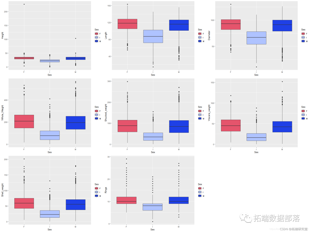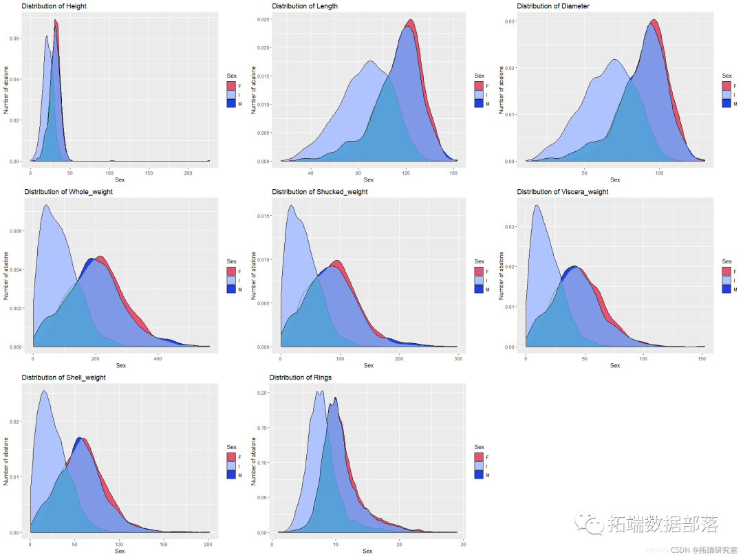 我们在探索性分析中发现的下一个有趣趋势是预测Sex 因子水平的分布 。因子水平female 和 male 所有其他预测因子 都非常相似。此外,整体数据也大致均匀地分布在female、 male 和 的 水平值之间 infant。以下是水平之间的分布及其相对于其他预测变量和响应变量的总体分布。