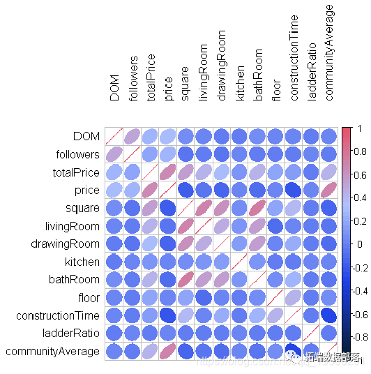 其他一些有趣的相关性:communityAverage与建筑时间呈负相关,这意味着在人口密集区建房所需的时间更短