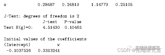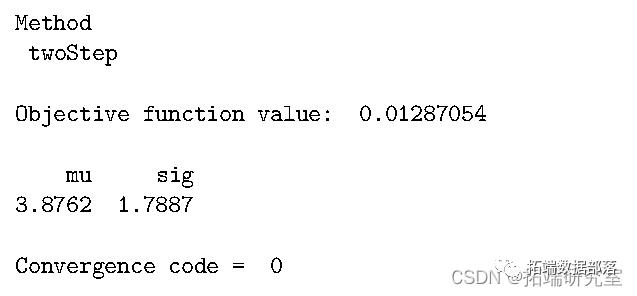 第三种方法是 CUE。如您所见,来自 ITGMM 的估计值用作起始值。但是,仅当 g 是函数时才需要起始值。当 g 是一个公式时,默认的起始值是通过设置权重矩阵等于单位矩阵获得的。