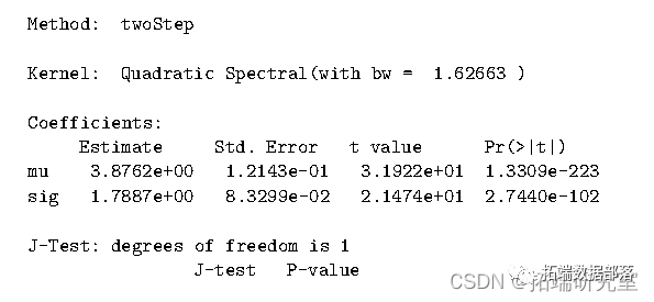因为矩条件是弱相关的,我们需要设置选项smooth=TRUE。在进行估计程序之前,我们需要了解平滑核和 HAC 估计器之间的关系。因此,该模型将使用核截断来估计。选择具有单位矩阵的 GMM 估计作为起始值。