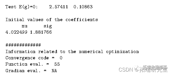 对于此示例,我们可以将选项 smooth 保留为其默认值,即 FALSE,因为_x_的 iid 属性。良好的起始值对 GEL 非常重要。最好的选择是样本均值和标准差。默认情况下,选项类型设置为 EL。