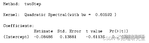 但是,在实际数据中,建议不要将此选项设置为“iid”,因为我们要使用 GMM 的原因之一是避免此类限制。最后,当模型是线性的时,不需要提供梯度,因为它已经包含在 gmm 中。第一个结果是:
