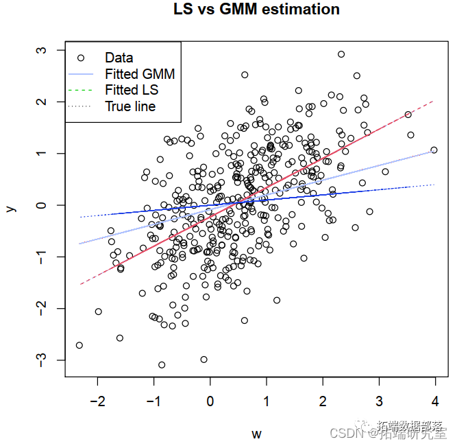 LS 似乎更适合模型。但是图形隐藏了内生性问题。_LS 高估了y_和_w_之间的关系,因为它没有考虑到一些相关性是由_yi_和_wi与误差项__i_正相关引起的。