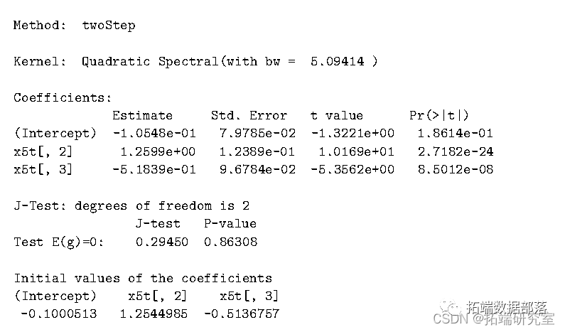 “系数的初始值”部分显示了用于计算 2 步 GMM 中的加权矩阵或 CUE 或迭代中的固定带宽的第一步估计GMM。