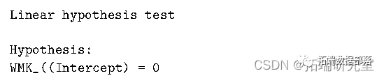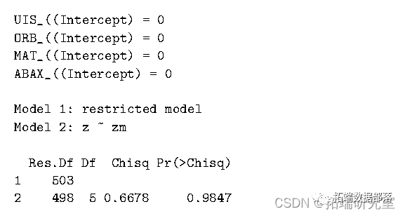 其中使用渐近卡方,因为默认分布需要正态假设。可以使用系数的名称执行相同的测试: