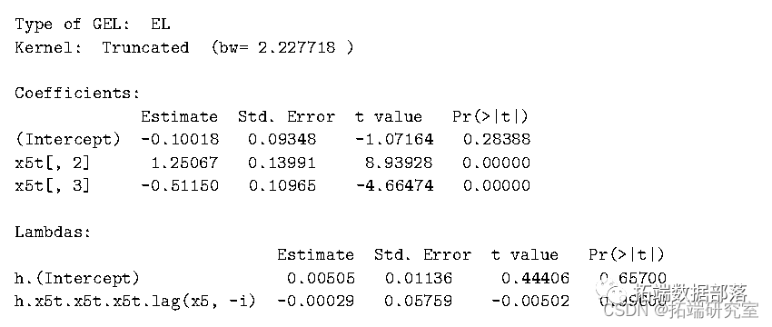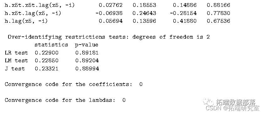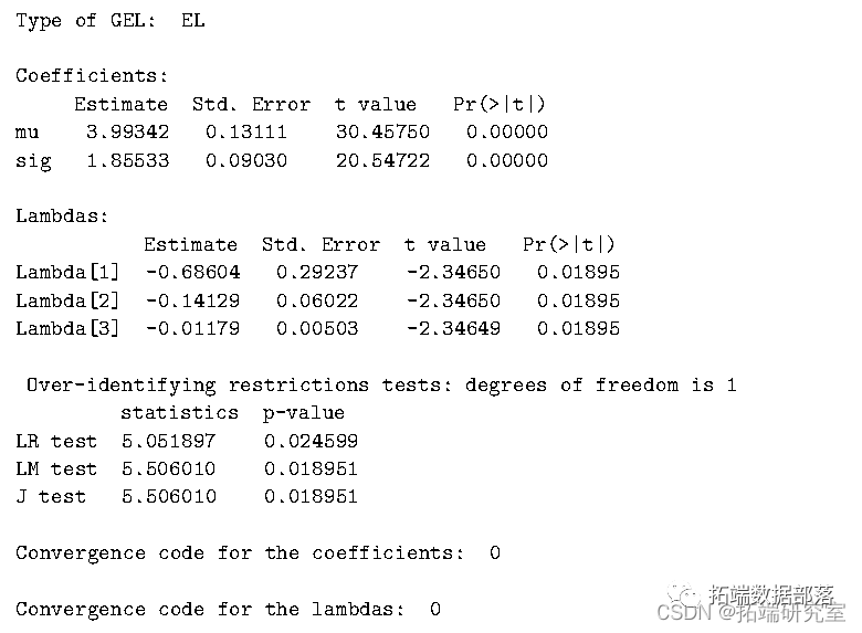 每个拉格朗日乘数代表矩条件隐含的约束的价格。summary 报告了两个收敛代码,一个用于_λ_ ,另一个用于_θ_。