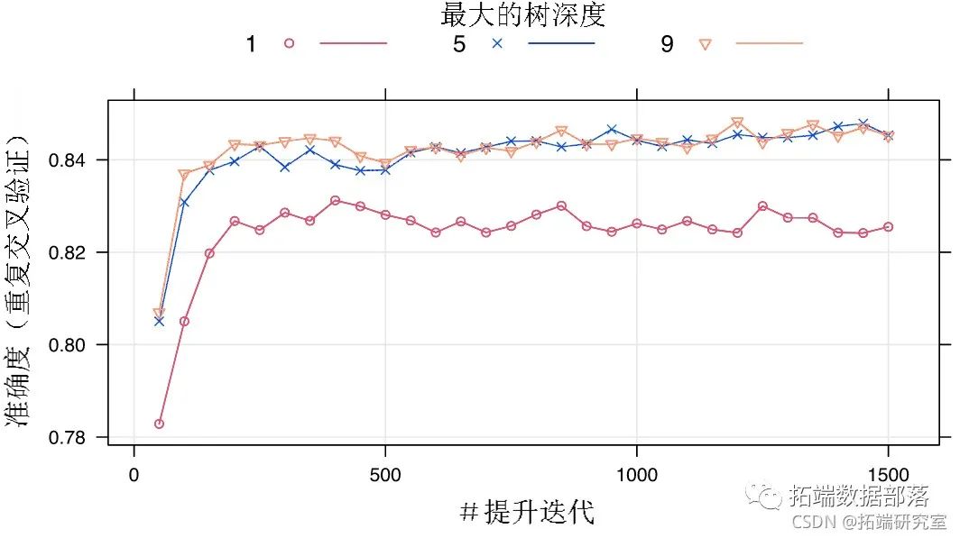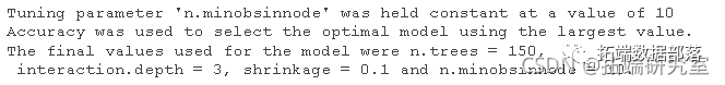 对于提升树模型,我们可以固定学习率并评估三个以上的n.trees值。