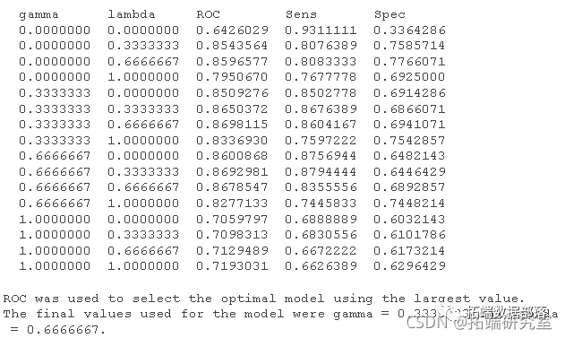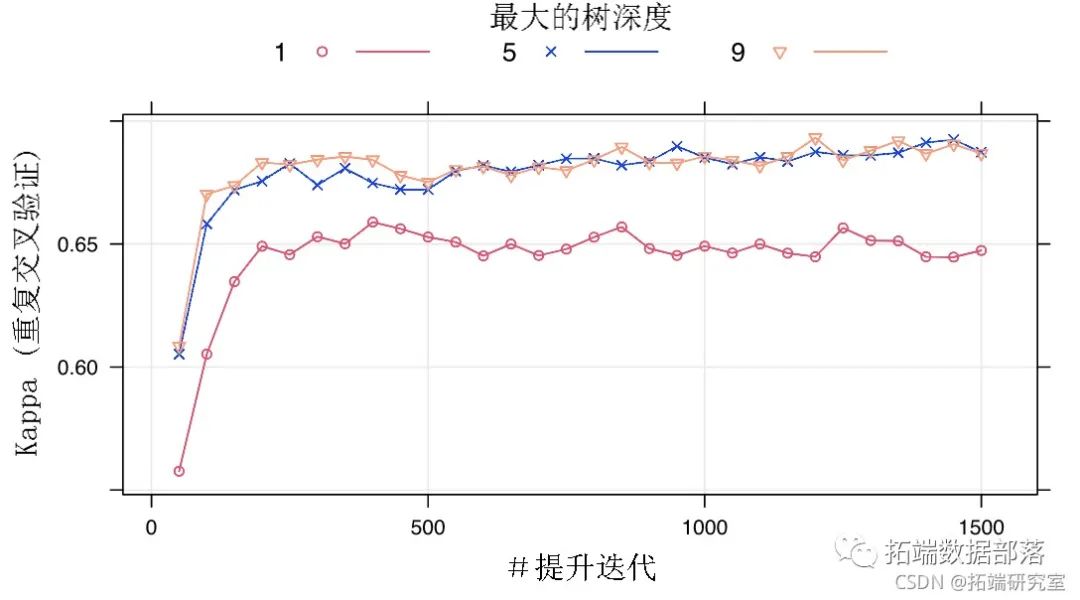 ”列是 Cohen 的(未加权的)Kappa 统计量在重采样结果中的平均值。 train
