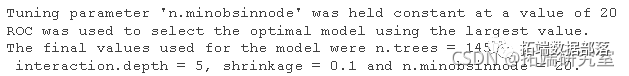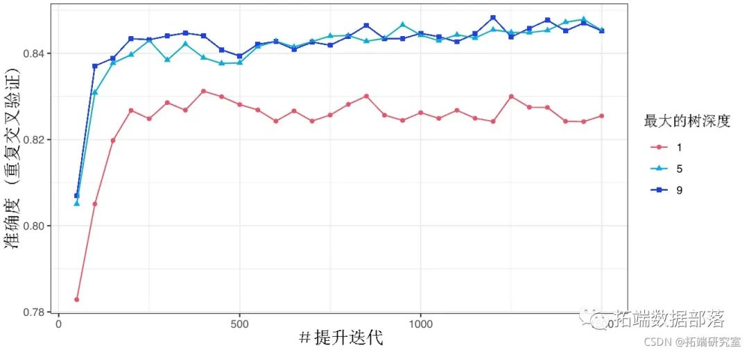 要使用此标准重建提升树模型,我们可以使用以下代码查看调整参数与 ROC 曲线下面积之间的关系: