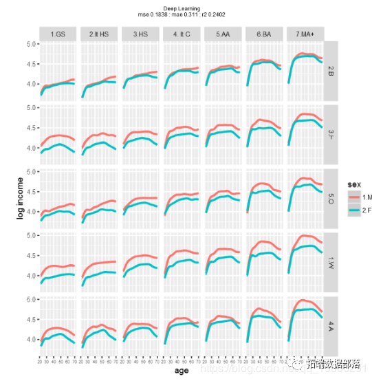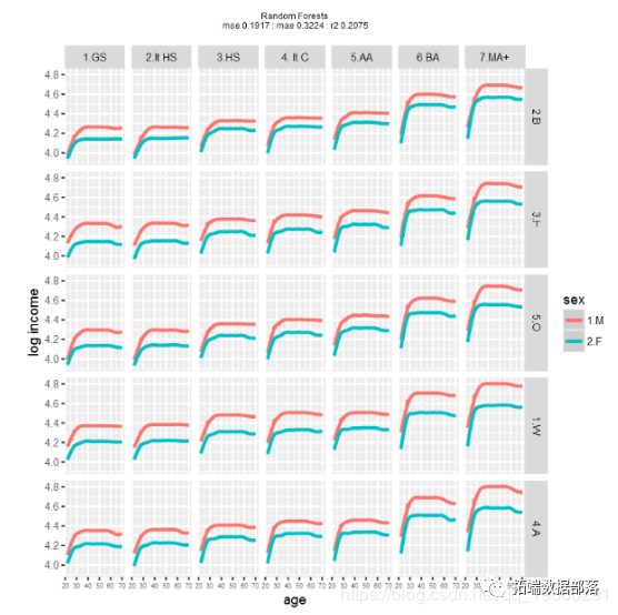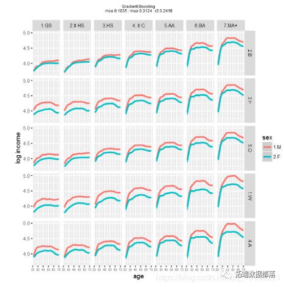 举个例子,如果我们根据整体精度选择之前的 boosted 树模型,我们会选择:n.trees = 1450,interaction.depth = 5,shrinkage = 0.1,n.minobsinnode = 20。该图相当紧凑,准确度值从 0.863 到 0.922 不等。一个不太复杂的模型(例如更少、更浅的树)也可能产生可接受的准确性。