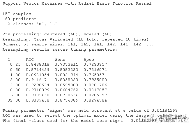 首先,支持向量机模型拟合声纳数据。使用preProc