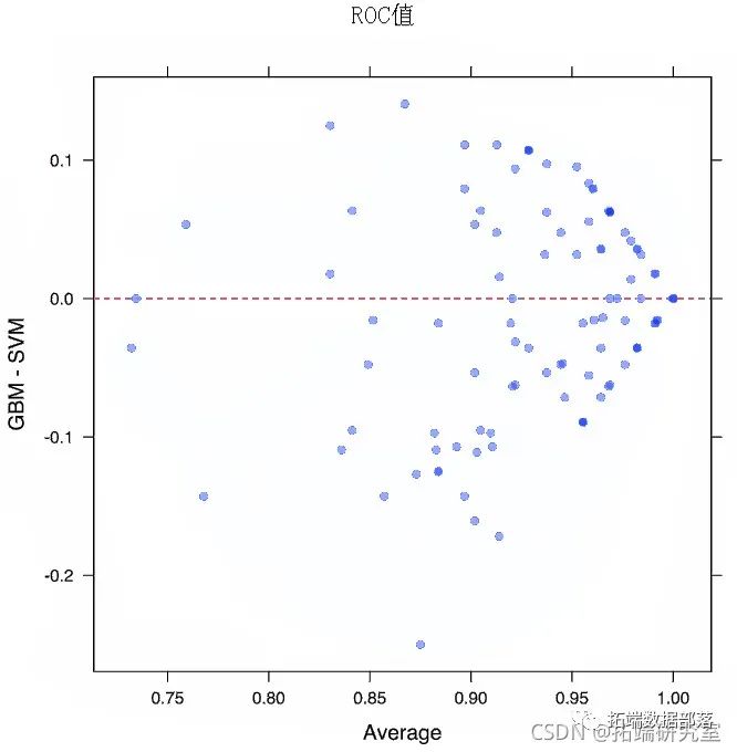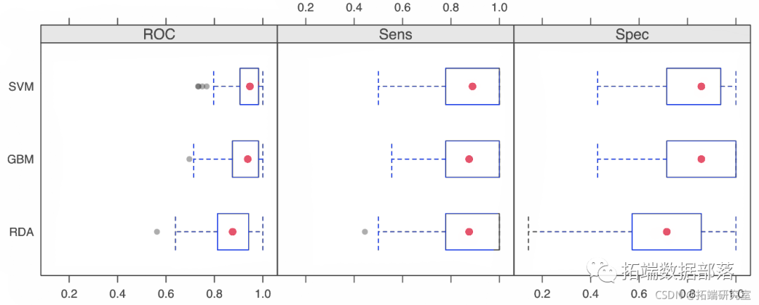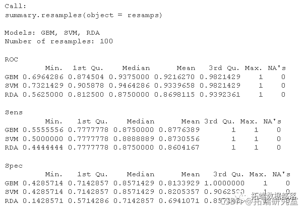 如上一节所示,自定义函数可用于计算重采样的平均性能分数。计算 ROC 曲线下的灵敏度、特异性和面积: