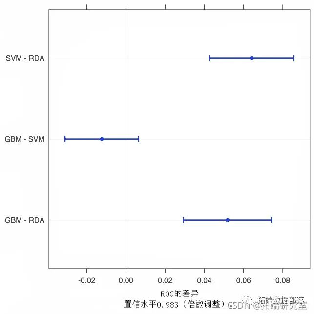由于模型是在相同版本的训练数据上拟合的,对模型之间的差异进行推断是有意义的。通过这种方式,我们减少了可能存在的样本内相关性。我们可以计算差异,然后使用一个简单的t检验来评估模型之间没有差异的无效假设。