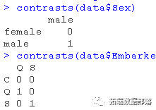 为了更好地了解R是如何处理分类变量的,我们可以使用contrasts()函数。这个函数向我们展示变量是如何虚拟出来的,以及如何在模型中解释它们。