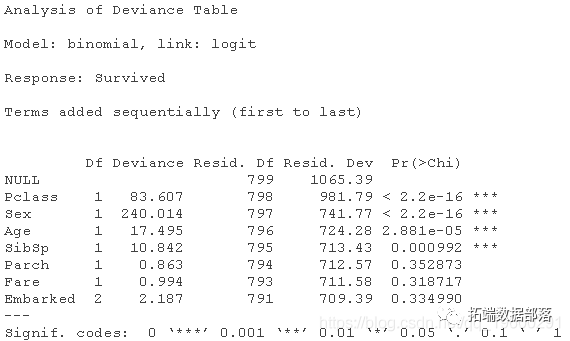 无效偏差和_残差_之间的差异显示了我们的模型与空模型(只有截距的模型)的对比情况。这个差距越大越好。分析该表,我们可以看到逐一添加每个变量时_残差_的下降。同样,加入Pclass、Sex和Age可以明显减少残差。尽管SibSp的p值很低,但其他变量似乎对模型的改善较少。这里的大p值表明,没有变量的模型或多或少解释了相同数量的变化。最终,我们希望看到的是_残差_和AIC的明显下降。