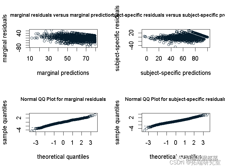 在第一个选项卡上,该函数显示用户选择的数据的预测区间。该函数通过从固定效应和随机效应项的模拟分布中抽样并组合这些模拟估计来快速计算预测区间,以产生每个观察的预测分布。