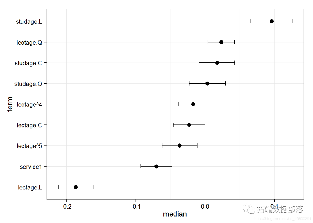 在下一个选项卡上,固定效应和组级效果的分布在置信区间图上显示。这些对于诊断非常有用,并提供了检查各种参数的相对大小的方法。