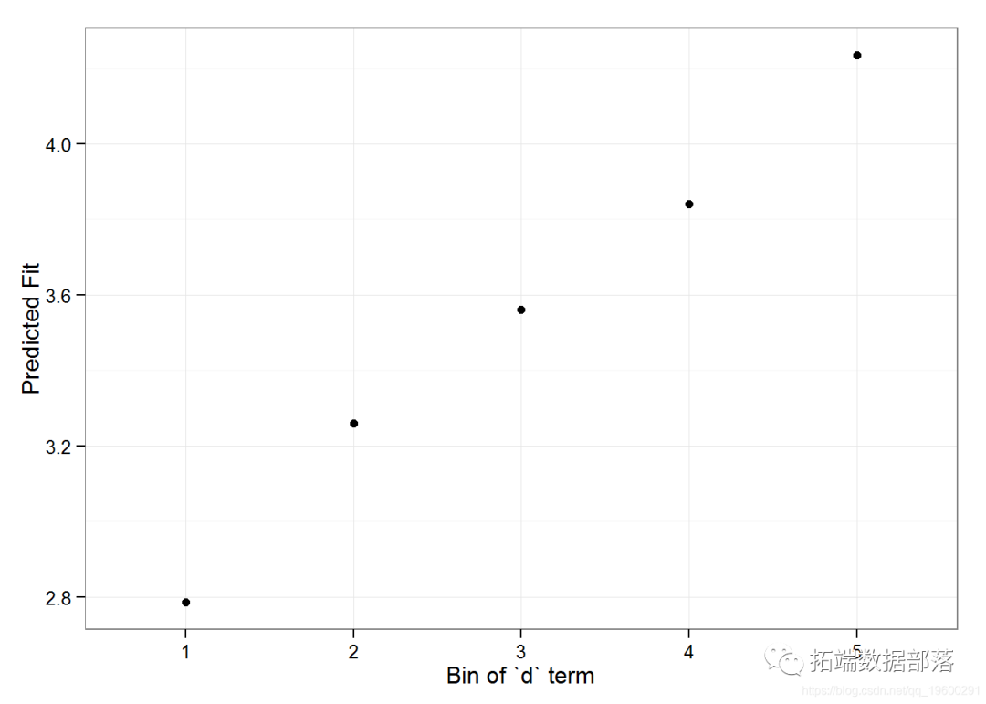 impact(m1, Eval\[7, \], groupFctr = "d", breaks = 5,n.sims = 300, level = 0.9)#> case bin AvgFit AvgFitSE nobs#> 1 1 1 2.787033 2.801368e-04 193#> 2 1 2 3.260565 5.389196e-05 240#> 3 1 3 3.561137 5.976653e-05 254#> 4 1 4 3.840941 6.266748e-05 265#> 5 1 5 4.235376 1.881360e-04 176