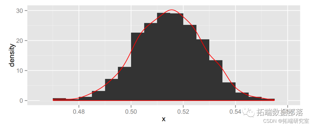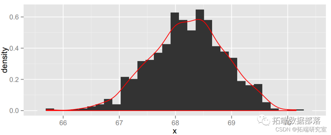 require(ggplot2)ggplot(dtframeanT = boot.satitics),as(x=meaime)) +geom_istram(binwih=0.25,aes(y=..ensity..)) +geodnity(olor"red")