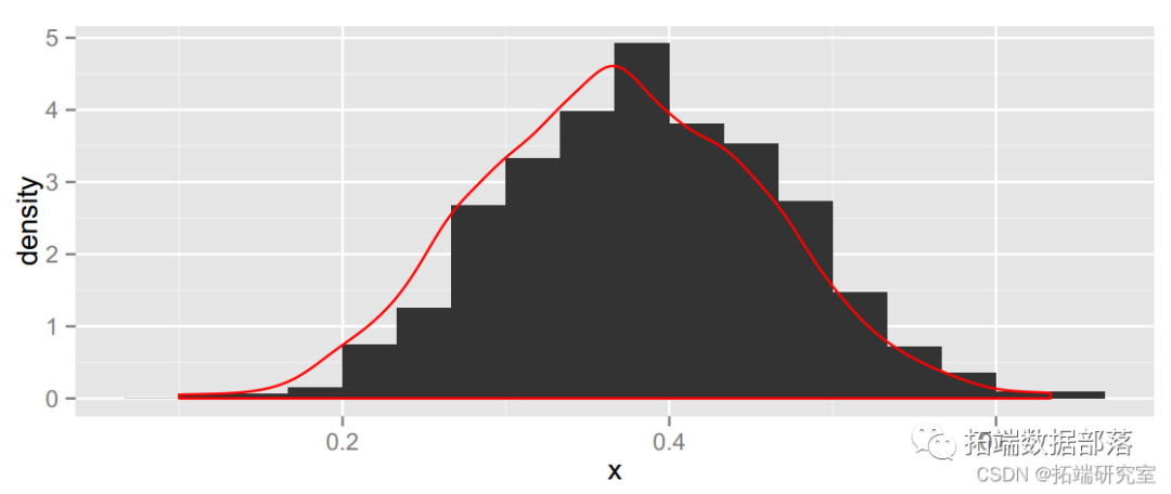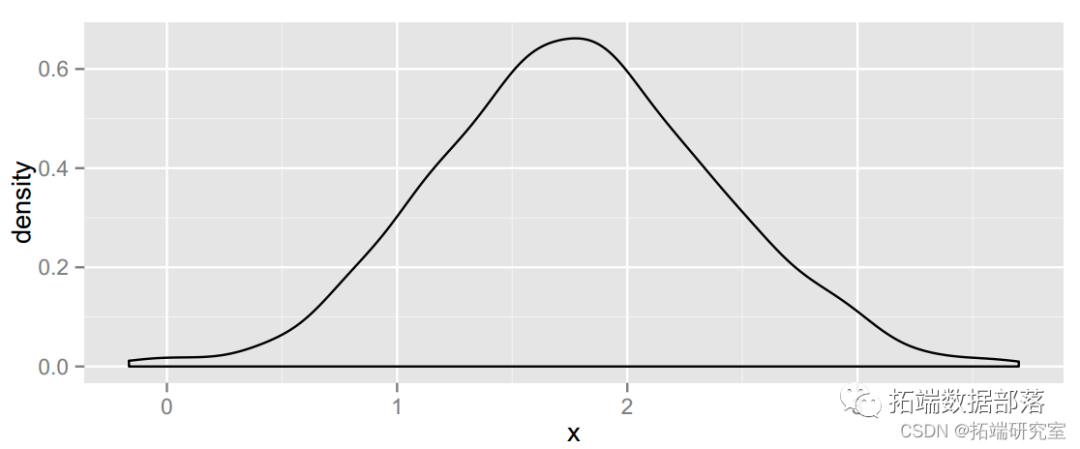 用密度图覆盖直方图来绘制不同的东西。在这里,ggplot() 需要一个带有输入数据的数据框,因此我们使用 data.frame() 创建一个带有唯一感兴趣的变量的数据框