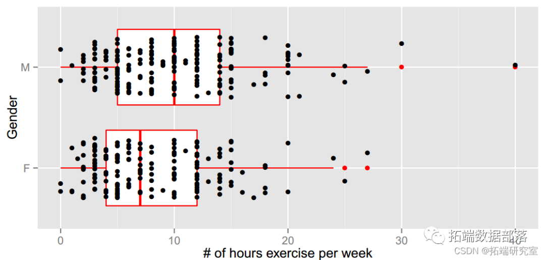 我们从这个总结中看到,在样本中,男性每周锻炼的时间比女性多。如果我们将此学生样本视为从大学生群体中随机选择的,我们可以估计每种性别的锻炼时间差异。