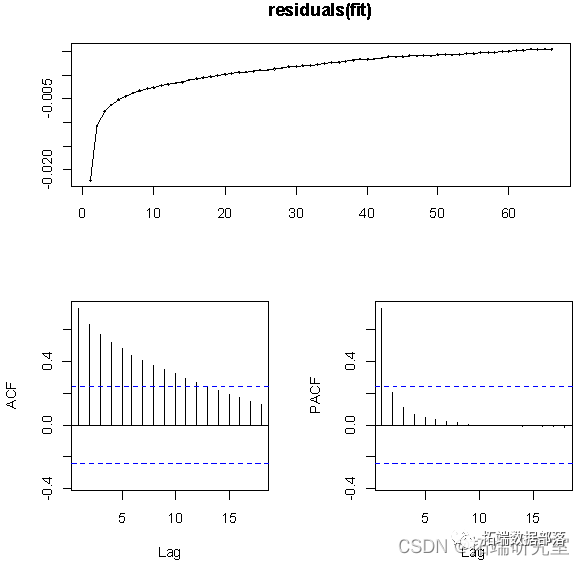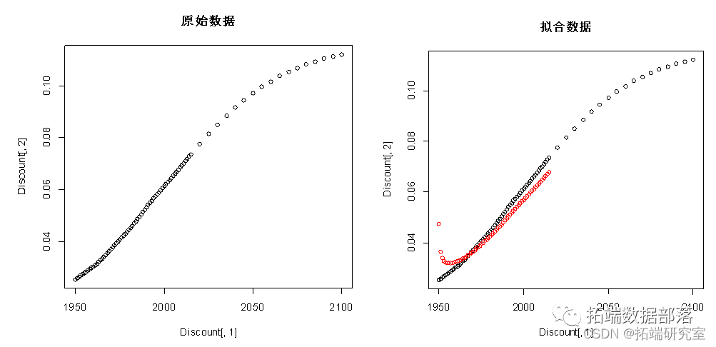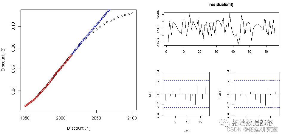 arfi(Diut\[,2\]\[)#建立arfima模型plot(Discnt\[,1\],Dscunt\[,2\])#原始数据points(Dicount\[,1\]\[1:66\],f$fittedcol="red")#拟合数据