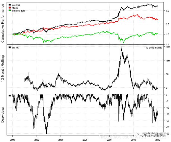 以下代码从Yahoo Fiance加载历史价格,并比较买入和持有,均值回归和趋势跟踪策略的效果: