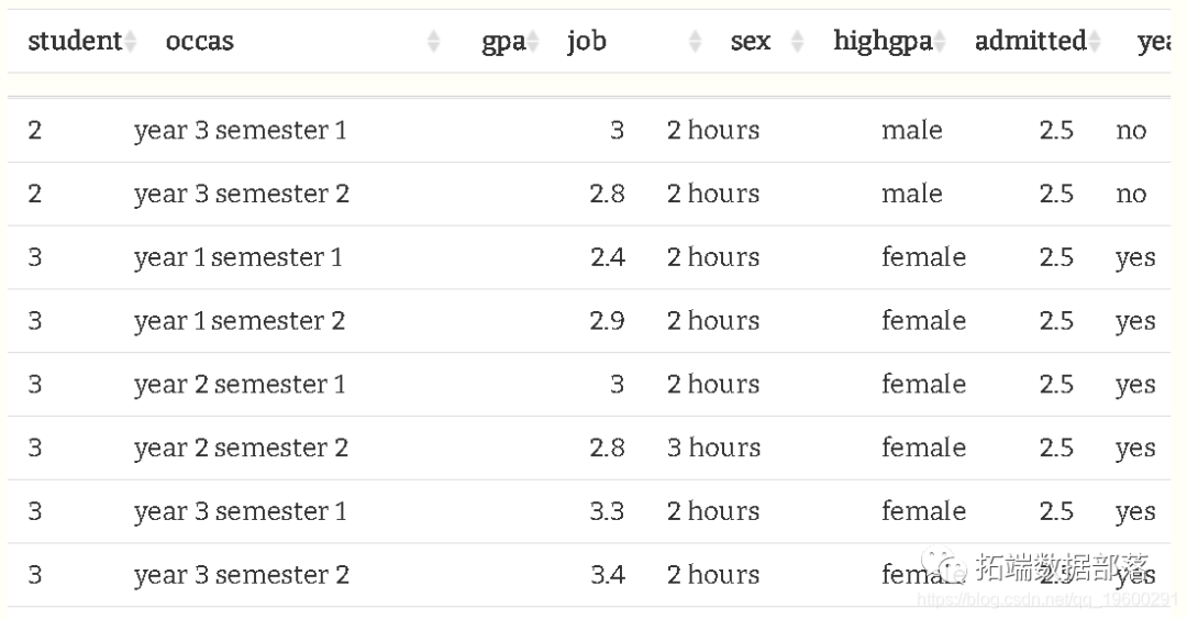下面我们将评估预测大学平均成绩(GPA)的因素。200名学生中的每个人都被评估了六次(前三年的每个学期),因此我们在学生中进行了观察分组。我们还有其他变量,如状态、性别和高中GPA。有些会以标签和数字的形式出现。