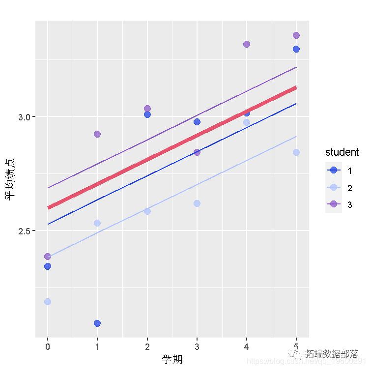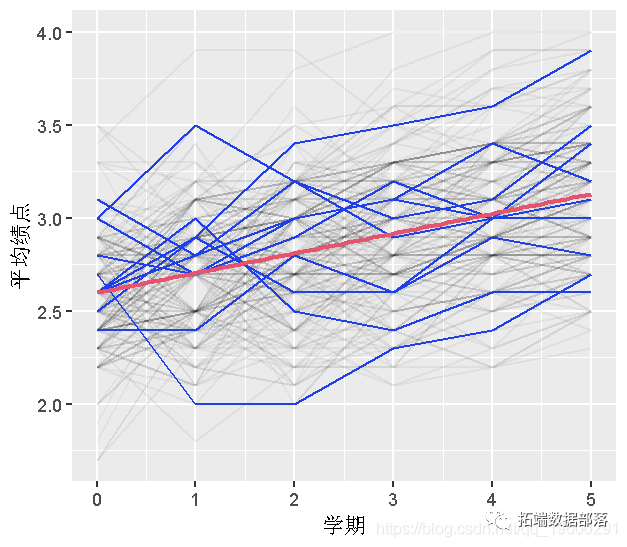所有学生的路径都以淡色路径显示,10个样本以粗体显示。我们稍后要做的回归所估计的总体趋势显示为红色。有两件事很突出。一是学生在开始时有很大的变数。第二,虽然GPA的总体趋势是随着时间的推移而上升但个别学生在这个轨迹上可能会有所不同。