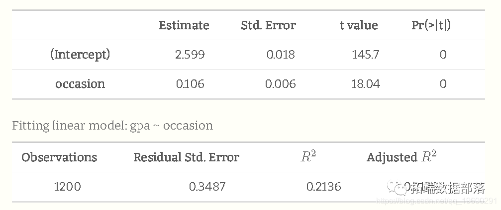 与标准回归输出相比,有一点是新的,那就是学生效应的估计方差/标准差(在我们之前的公式描述中是ττ)。这告诉我们,平均而言,当我们从一个学生转移到另一个学生时,GPA会有多大的变动。换句话说,即使在根据时间点进行预测后,每个学生都有自己独特的偏差,而这个值(就标准偏差而言)是整个学生的估计平均偏差。