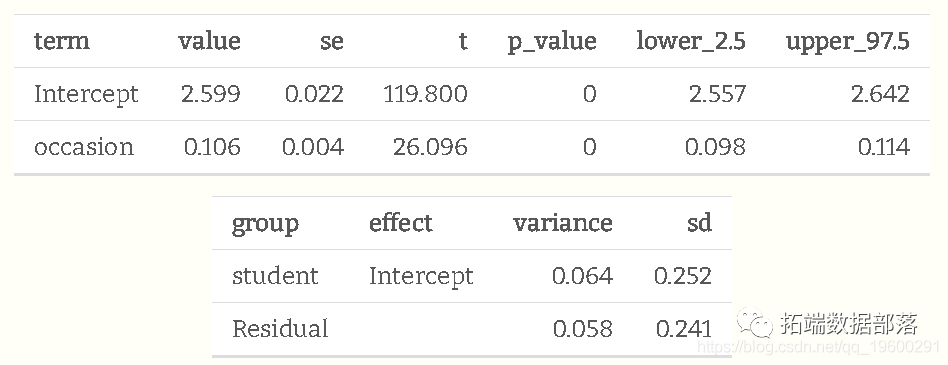 首先我们看到,截距和时间的系数,即在这里可以称为固定效应,与我们在标准回归中看到的相同,其解释也相同。另一方面,这里的标准误差是不同的,尽管最后我们的结论在统计意义上是相同的。请特别注意,截距的标准误差已经增加。从概念上讲,你可以认为允许每个人的随机截距允许我们获得关于个人的信息,同时认识到关于总体平均数的不确定性。